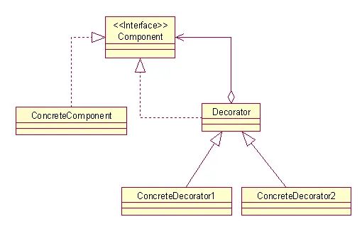 具体实现过程:不论是具体的组件,和装饰过后的组件,都希望可以用相同过的方式使用,所以实现同一个接口。装饰类需要持有一个具体组件的实例,才能调用他的方法,所以需要一个聚合关联。