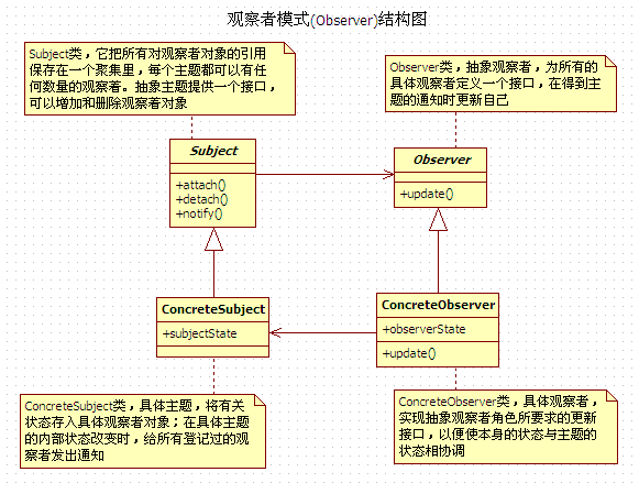 例如:老师有电话号码,学生需要知道老师的电话号码以便于在合适的时候拨打,在这样的组合中,老师就是一个被观察者(Subject),学生就是需要知道信息的观察者,当老师的电话号码发生改变时,学生得到通知,并更新相应的电话记录。