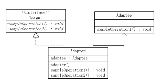 public class Adapter { private Adaptee adaptee; public Adapter(Adaptee adaptee){ this.adaptee = adaptee; } /** * 源类Adaptee有方法sampleOperation1 * 因此适配器类直接委派即可 */ public void sampleOperation1(){ this.adaptee.sampleOperation1(); } /** * 源类Adaptee没有方法sampleOperation2 * 因此由适配器类需要补充此方法 */ public void sampleOperation2(){ //写相关的代码 } }