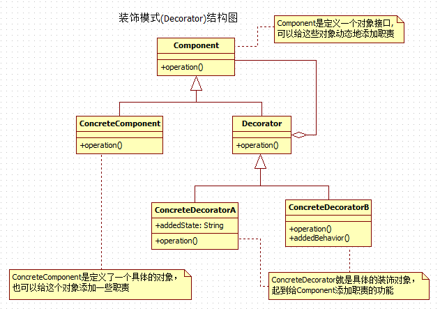 Decorator是装饰抽象类,继承了Component,从外类来扩展Component类的功能,但对于Component来说,是无需知道Decorator存在的。ConcreteDecorator就是具体的装饰对象,起到给Component添加职责的功能。