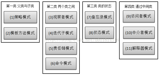 行为型模式,共十一种:策略模式、模板方法模式、观察者模式、迭代子模式、责任链模式、命令模式、备忘录模式、状态模式、访问者模式、中介者模式、解释器模式。这11中模式的关系:第一类:通过父类与子类的关系进行实现。第二类:两个类之间。第三类:类的状态。第四类:通过中间类