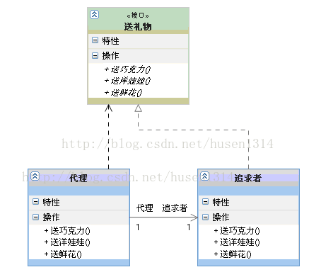 在代理模式中,追求者通过代理转发自己送给心爱女孩礼物,这样追求者类就与女孩类的关系减少,