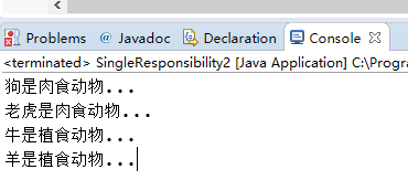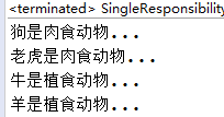 很明显,牛、羊并不是肉食动物,而是植食动物,所以上述的代码有点问题。下面我们修改时如果遵循单一职责原则,需要将Animal类细分为肉食动物和植食动物,代码如下: