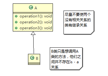 此时A类和B类之间的耦合度很高,而且如果B类只想用A类的其中一些方法, 如果使用继承将会全部方法都继承下来了,造成冗余。在实际工作中,只有满足is - a关系的两个类才能使用继承关系。