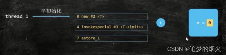 线程 1 暂停执行,线程 2 进入到 cpu 执行,引用变量 t 不为空,指向的是半成品对象