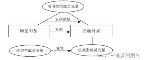 在浅克隆中,当对象被复制是只复制它本身和其中包含的值类型的成员变量,而引用类型的成员对象并没有复制。
