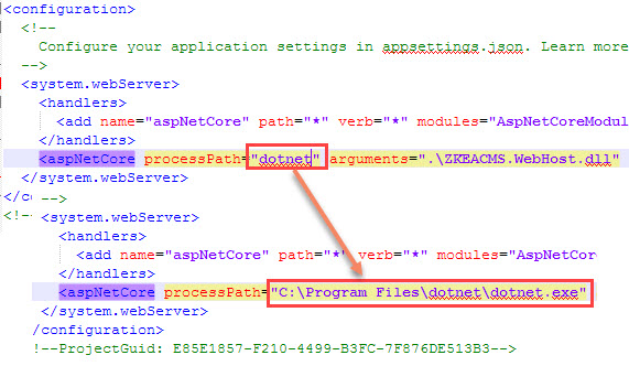 打开程序的web.config,修改processPath="dotnet"为完整的路径processPath="C:Program Filesdotnetdotnet.exe"