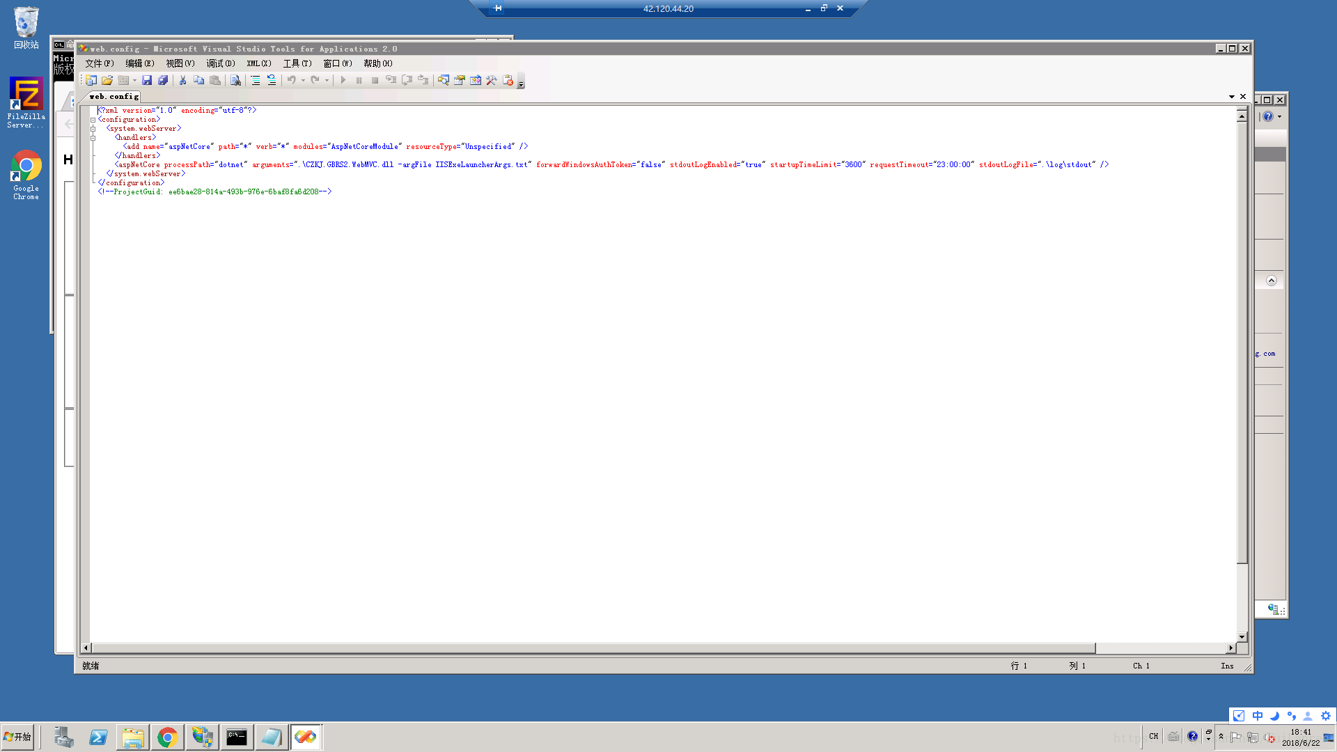 在Web.Config找到 <aspNetCore processPath="dotnet" arguments=".CZKJ.GBRS2.WebMVC.dll" forwardWindowsAuthToken="false" stdoutLogEnabled="true" startupTimeLimit="3600" requestTimeout="23:00:00" stdoutLogFile=".logstdout" />