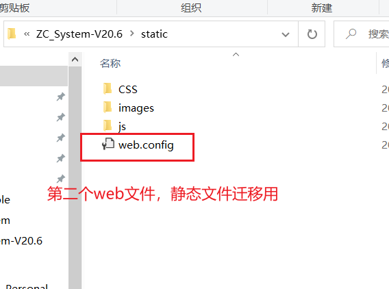 1、进入到static文件夹中创建第二个个web.config文件。该文件用于将项目所有的静态资源文件css,js,img等全部导入到根目录下的static文件夹。方便服务器查找静态文件