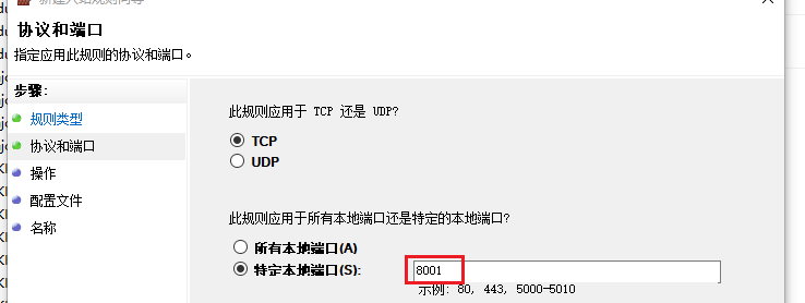 (3)点击下一步,输入自己要设的端口号(我设置的8001),然后一直点下一步,命名规则,完成。就可以在入站规则看到这个规则。