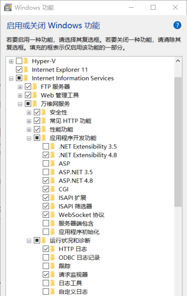 打开windows的“控制面板”→“程序和功能”→“打开或关闭Windows功能”,找到Internet Information Services(Internet 信息服务),按照下图进行勾选。