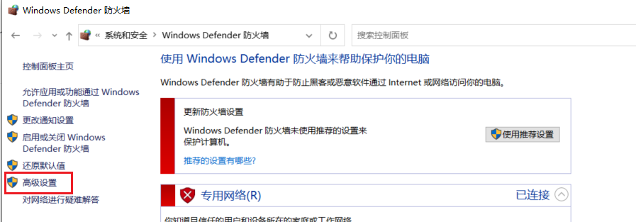 (1)打开windows的“控制面板”→“系统和安全”→“Windows Defender防火墙”,单机进入防火墙配置界面。然后界面左侧进入高级设置。