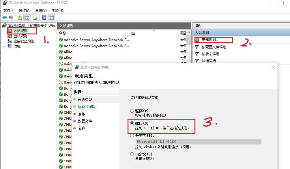 (2)进入高级安全Windows Defender防火墙配置界面,选中左侧“入站规则”栏目,在选中右侧操作栏的“新建规则”选项。弹出的向导中选择“端口(o)”。