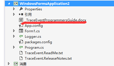 最后提一句,怎么找到官方文档呢?在使用nuget获取Microsoft TraceEvent Library之后,工程文件中就会多一个名为“_TraceEventProgrammersGuide.docx”的文件,它就是官方文档。如下所示: