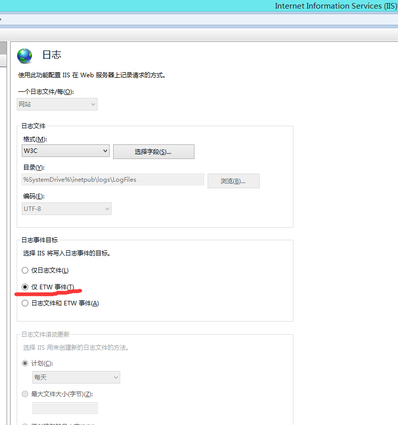 (3)针对方法3,发现iis日志的保存目标可以为ETW事件,故采用。如下图所示: