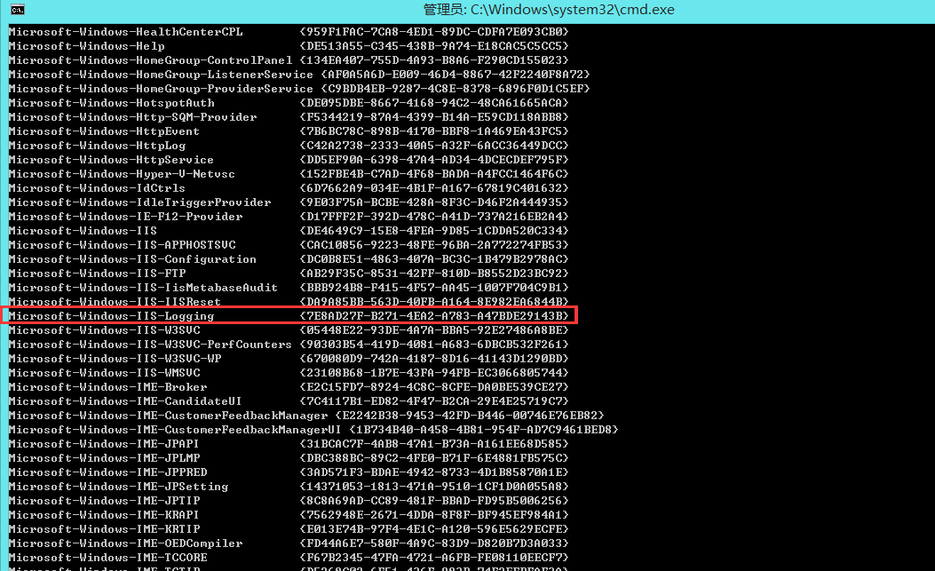 (1)怎么知道IIS日志模块的事件提供程序的名称是“Microsoft-Windows-IIS-Logging”呢?答案是通过命令行指令:logman query providers。下面是这个指令返回的结果: