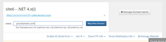 第二步:添加新的网站。如图,点击“添加新站”,输入网站名称。点击“manage Doman Name”将域名映射到新的网址。映射的时候在域名服务提供商处修改Nameservers的名称。