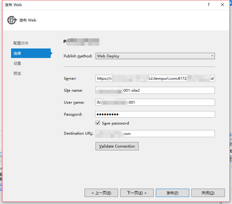第四步:打开Visual Studio工程,右键工程名,选择发布,在“连接”选项出将WebDeploy info的信息复制进去,点击“发布”即可完成Asp.net MVC5工程的发布。无需配置IIS,无需安装数据库。
