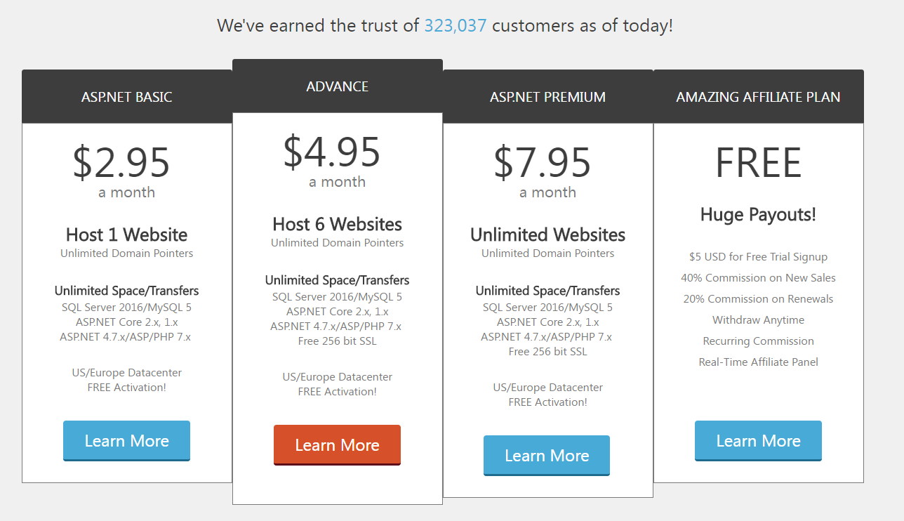 选用SmarterAsp提供的专用Asp.net MVC工程服务器进行MVC5工程的部署。SmarterAsp是老牌的.Net服务器运营商,主要提供的是基于Asp.net工程的服务器部署与运营。不同于阿里云和Hostgator,价格非常亲民,而且提供了全功能,60天的免费Plan,可以提供给新手进行项目部署与服务器测试。支持共享服务器的方案与独立服务器的方案。对于新手而言,选择共享服务器方案足矣。具体的价格如下。