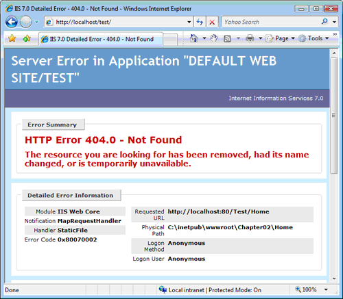 然而不幸的是,旧版本的IIS不会把这样的请求传递给ASP.NET框架,因此这些请求也不会被路由到控制器。比如我们请求/Home/Index这个URL时,会产生一个错误页面的提示。如下图