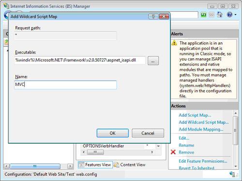 如果我们不想修改ASP.NET MVC应用程序中的URL地址,并且可以访问到Web服务器,那我们可以通过创建wildcard script map方式来把所有请求映射到ASP.NET框架中去。这样就避免修改默认的由表了。