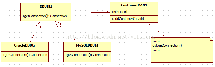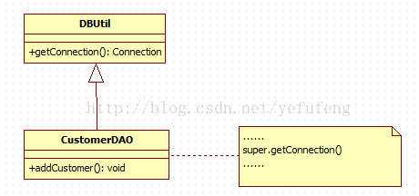 公司开发人员在初期的CRM系统设计中,考虑到客户数量不多,系统采用MySQL作为数据库,与数据库操作有关的类如CustomerDAO类等都需要连接数据库,连接数据库的方法getConnection()封装在DBUtil类中,由于需要重用DBUtil类的getConnection()方法,设计人员将CustomerDAO作为DBUtil类的子类,初始设计方案结构如图所示。