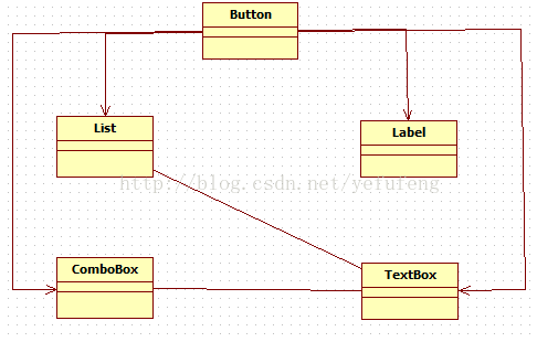 公司所开发CRM系统包含很多业务操作窗口,在这些窗口中,某些界面控件之间存在复杂的交互关系,一个控件事件的触发将导致多个其他界面控件产生响应,例如,当一个按钮(Button)被单击时,对应的列表框(List)、组合框(ComboBox)、文本框(TextBox)、文本标签(Label)等都将发生改变,在初始设计方案中,界面控件之间的交互关系可简化为如图所示结构:
