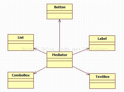 在本实例中,可以通过引入一个专门用于控制界面控件交互的中间类(Mediator)来降低界面控件之间的耦合度。引入中间类之后,界面控件之间不再发生直接引用,而是将请求先转发给中间类,再由中间类来完成对其他控件的调用。当需要增加或删除新的控件时,只需修改中间类即可,无须修改新增控件或已有控件的源代码,重构后结构如图所示。