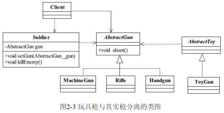public class Client { public static void main(String[] args) { //产生三毛这个士兵 Soldier sanMao = new Soldier(); sanMao.setGun(new ToyGun()); sanMao.killEnemy(); } }