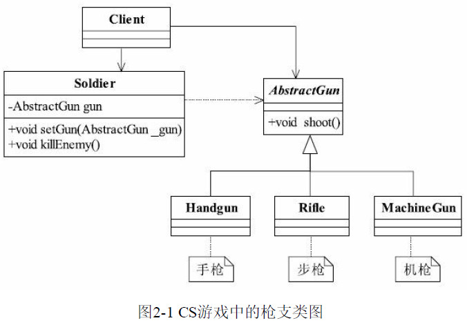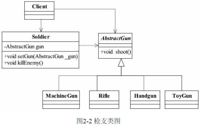 public class Soldier { //定义士兵的枪支 private AbstractGun gun; //给士兵一支枪 public void setGun(AbstractGun _gun){ this.gun = _gun; } public void killEnemy(){ System.out.println("士兵开始杀敌人..."); gun.shoot(); } }