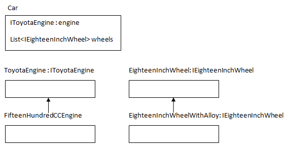 注意:这里的 Car 就是高层模块;它依赖于抽象接口IToyotaEngine 和 IEighteenInchWheel.