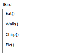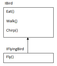 注意到IBird接口包含很多鸟类的行为,包括Fly()行为.现在如果一个Bird类(如Ostrich)实现了这个接口,那么它需要实现不必要的Fly()行为(Ostrich不会飞)。因此,这个"胖接口"应该拆分成两个不同的接口,IBird和IFlyingBird, 而IFlyingBird继承自IBird。如下图所示:
