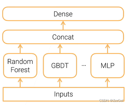 单层Stacking:把多个base learner组合在一起降低方差,在同样的数据集上训练不同的模型,把不同模型的输出concat起来,经过全连接层得到最终的结果。
