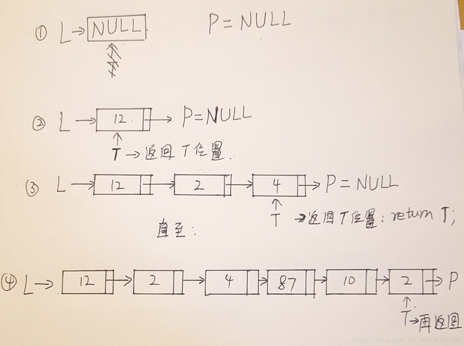 while( L&&L->Next!=P ) //在未找到NULL的前一个结点都要一直往后移