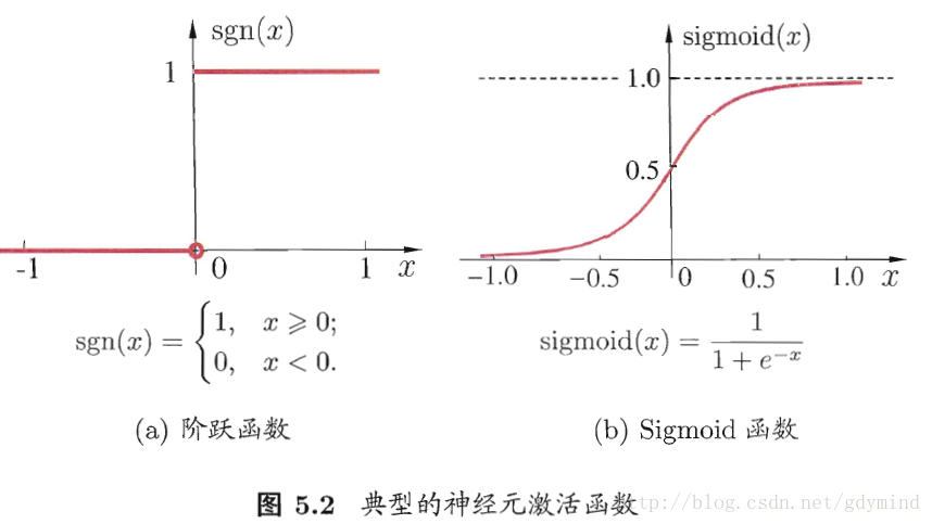 - 激活函数中1代表兴奋,0代表不兴奋。理想中激活函数位阶跃函数,为方便处理用连续的Sigmoid函数。