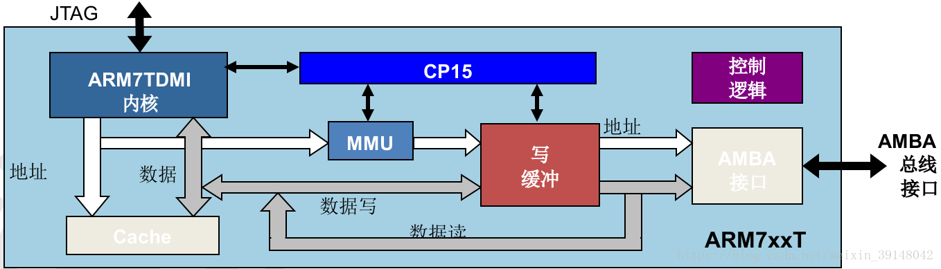 MRC Pn,op1,Rd,CRn,CRm,op2 //mrc p15,0,r0,c1,c0,0 读入cp15的c1寄存器的内容到r0中