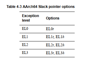 t后缀表明了SP_EL0 stack pointer被选择。h后缀表明SP_ELn stack pointer被选择。