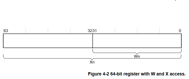 从W寄存器中读取将忽视对应的X寄存器的高32位并不对它们做修改。对W寄存器进行写将X寄存器的高32位设置位0。即,写0xffffffff到W0将X0设置位0x00000000fffffff。