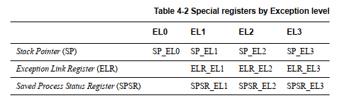 note: 与一个异常级别相关的寄存器组ELR_ELn和SPSR_ELn在执行在更低的异常级别时保持着它们的状态。