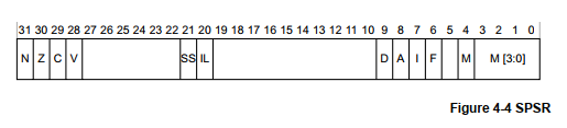 当异常产生时,处理器的状态保存在相关的保存进程状态寄存器SPSR,与ARMv7的CPSR相同的方式。在异常产生之前SPSR保持着PSTATE值并在异常返回时恢复PSTATE值。