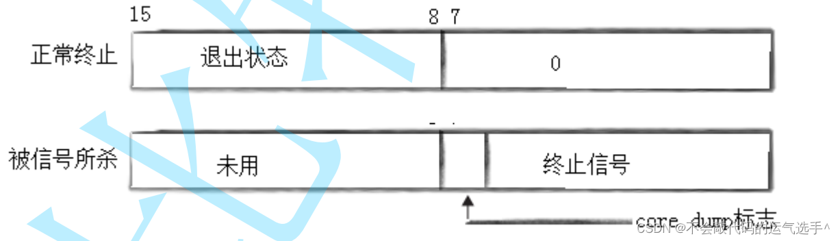 第一个参数id表示需要等待的进程的pid,如果是-1,就是等待所有其他进程。第二个status是一个输出型参数,我们要按byte进行学习。我们只用关注32中的低16位。