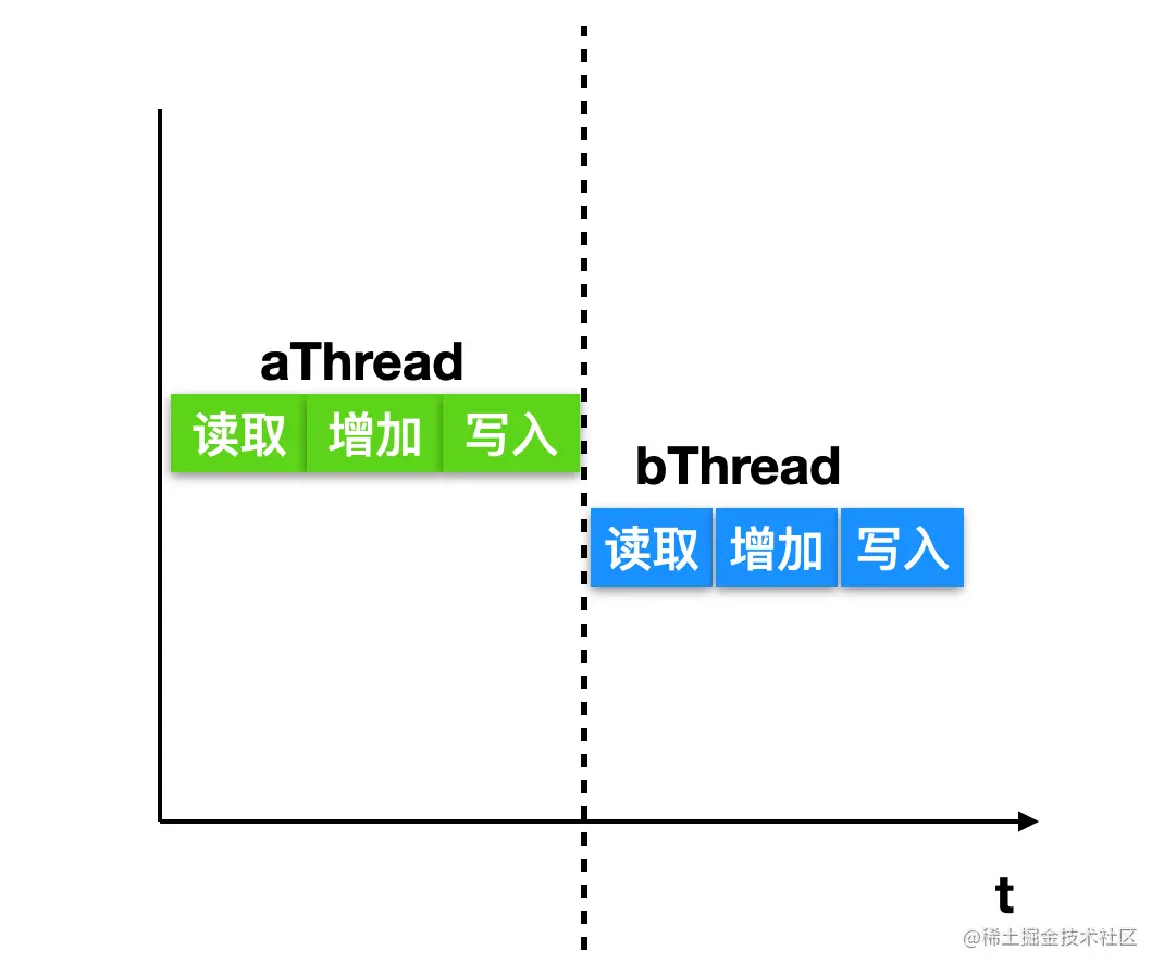 可以看到,当 aThread 在执行完整个 i++ 的操作后,操作系统对线程进行切换,由 aThread -> bThread,这是最理想的操作,一旦操作系统在任意 读取/增加/写入 阶段产生线程切换,都会产生线程安全问题。例如如下图所示