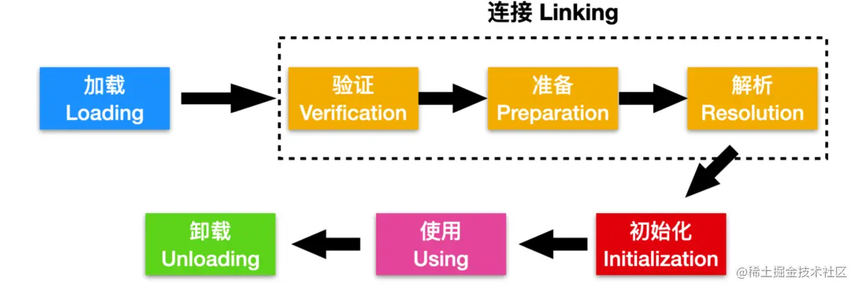 这是一个 JVM 加载类的过程图,也称为类的生命周期,类从加载到 JVM 到卸载一共会经历五个阶段 加载、连接、初始化、使用、卸载。这五个过程的执行顺序是一定的,但是在连接阶段,也会分为三个过程,即 验证、准备、解析 阶段,这三个阶段的执行顺序不是确定的,通常交叉进行,在一个阶段的执行过程中会激活另一个阶段。