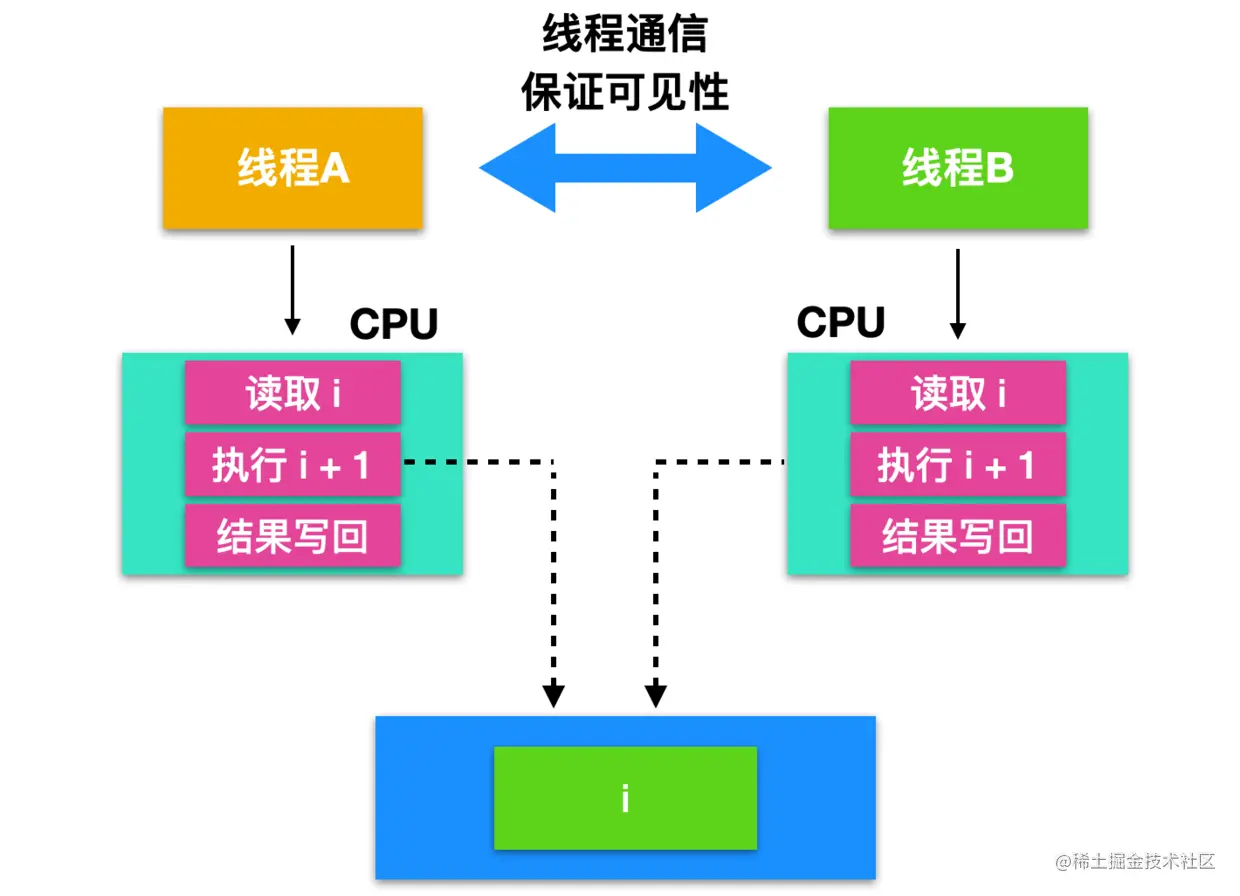 当两个线程开始运行后,每个线程都会把 i 的值读入到 CPU 缓存中,然后执行 + 1 操作,再把 + 1 之后的值写入内存。因为线程间都有各自的虚拟机栈和程序计数器,他们彼此之间没有数据交换,所以当 aThread 执行 + 1 操作后,会把数据写入到内存,同时 bThread 执行 + 1 操作后,也会把数据写入到内存,因为 CPU 时间片的执行周期是不确定的,所以会出现当 aThread 还没有把数据写入内存时,bThread 就会读取内存中的数据,然后执行 + 1操作,再写回内存,从而覆盖 i 的值,导致 aThread 所做的努力白费。