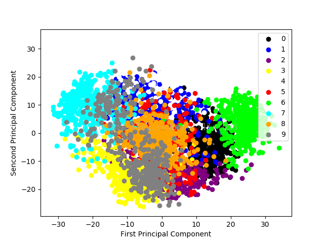 # 显示10类手写体数字图片经PCA压缩后的2维空间分布。