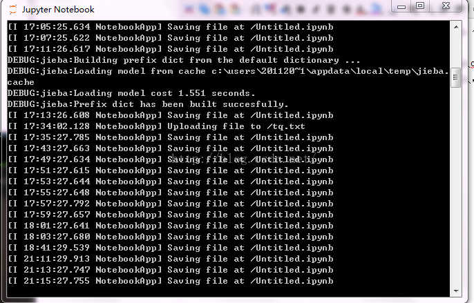 安装Anaconda后,在程序中找到Anaconda下的Jupyter Notebook点击进入,如下图,此界面在jieba分词过程中不可关闭。打开此界面后,浏览器会自动转到jupyter界面。在浏览器打开的jupyter界面中进行分词程序的编辑。