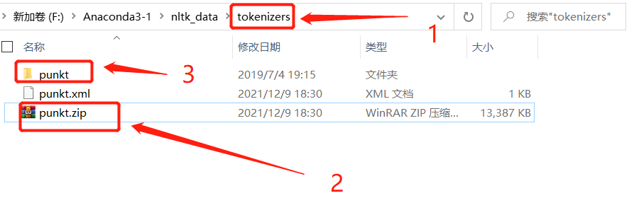 5、后来,punkt出现问题。进入tokenizers文件夹中,解压punkt.zip到当前文件夹,解压后即可看到punkt文件夹。