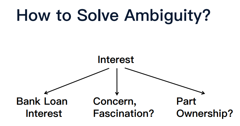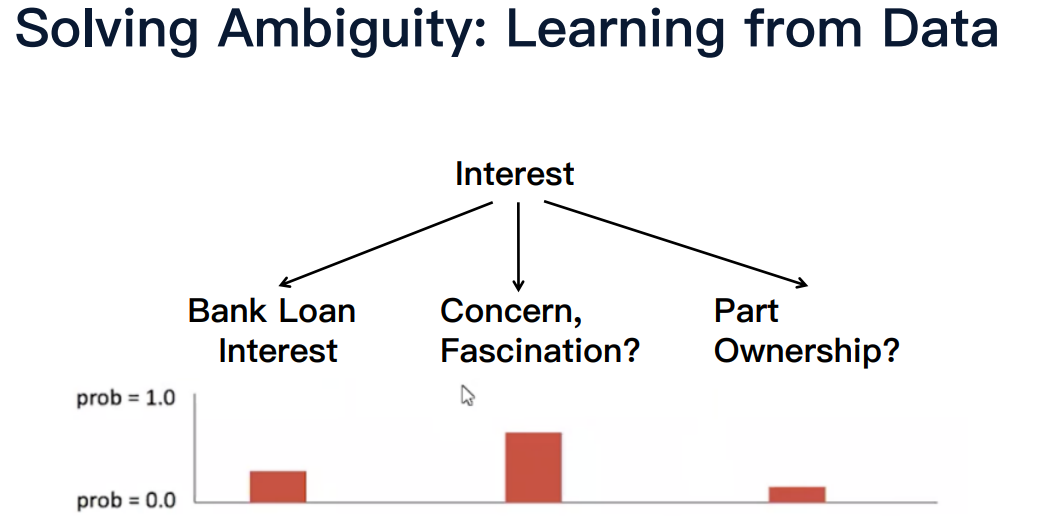 从这三个示意图可以看出,我们在解决ambiguity问题时,可以根据这个单词在所在的语料库里边的概率,选择概率高的做为结果,例如当在 国际商用机器公司 相关的预料库中interest被理解为所有权的概率高,就把他理解为所有权。这样的话我们就能够得到最为可能的答案,但关于解决一词多义问题,有很多的方法,但并没有完全能够正确达到我们想要的结果,这还是当前研究的主要问题之一。