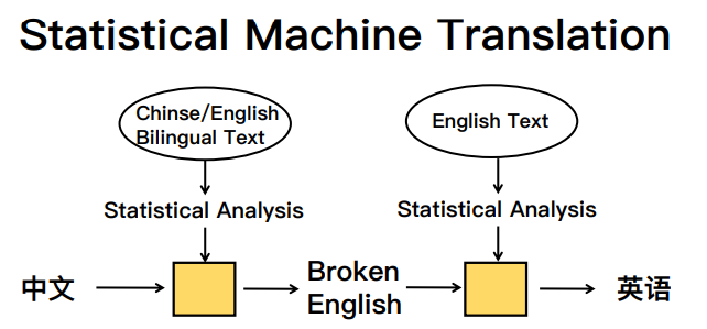 流程: 根据输入的“中文文本” ,通过类似于字典的“中文转换英文 文本 ”统计分析得出翻译的结果,下一步“Broken English”把句子里的单词分离开,下一步通过“英文文本” 统计分析出来,上一步所到的单词如何组合是符合语法结构的英语。(上边第一个黄色方块实际上TL(Translation Model翻译模型),第二个黄色方块实际上是叫做LM(language model 语言模型)