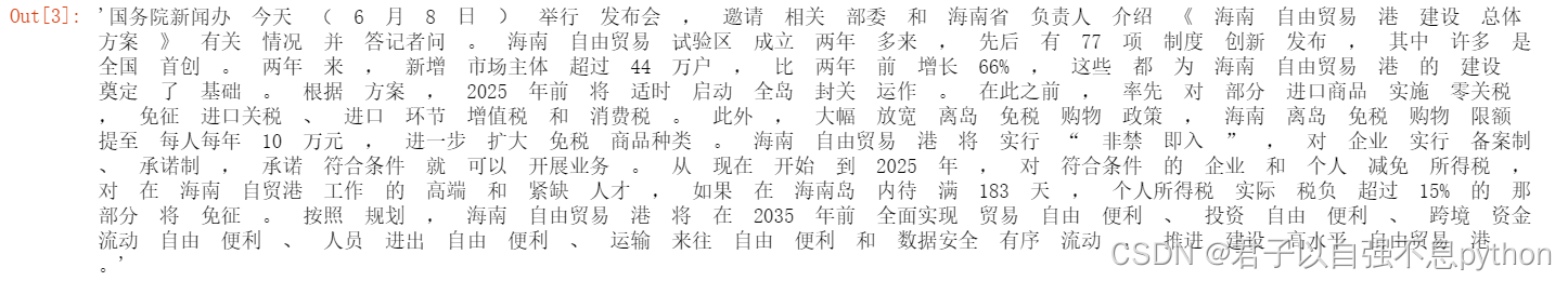 words = '国务院新闻办 今天 ( 6 月 8 日 ) 举行 发布会 , 邀请 相关 部委 和 海南省 负责人 介绍 《 海南 自由贸易 港 建设 总体方案 》 有关 情况 并 答记者问 。 海南 自由贸易 试验区 成立 两年 多来 , 先后 有 77 项 制度 创新 发布 , 其中 许多 是 全国 首创 。 两年 来 , 新增 市场主体 超过 44 万户 , 比 两年 前 增长 66% , 这些 都 为 海南 自由贸易 港 的 建设 奠定 了 基础 。 根据 方案 , 2025 年前 将 适时 启动 全岛 封关 运作 。 在此之前 , 率先 对 部分 进口商品 实施 零关税 , 免征 进口关税 、 进口 环节 增值税 和 消费税 。 此外 , 大幅 放宽 离岛 免税 购物 政策 , 海南 离岛 免税 购物 限额 提至 每人每年 10 万元 , 进一步 扩大 免税 商品种类 。 海南 自由贸易 港 将 实行 “ 非禁 即入 ” , 对 企业 实行 备案制 、 承诺制 , 承诺 符合条件 就 可以 开展业务 。 从 现在 开始 到 2025 年 , 对 符合条件 的 企业 和 个人 减免 所得税 , 对 在 海南 自贸港 工作 的 高端 和 紧缺 人才 , 如果 在 海南岛 内待 满 183 天 , 个人所得税 实际 税负 超过 15% 的 那 部分 将 免征 。 按照 规划 , 海南 自由贸易 港 将 在 2035 年前 全面实现 贸易 自由 便利 、 投资 自由 便利 、 跨境 资金 流动 自由 便利 、 人员 进出 自由 便利 、 运输 来往 自由 便利 和 数据安全 有序 流动 , 推进 建设 高水平 自由贸易 港 。'